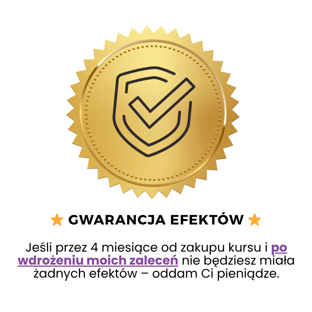 Dlatego daję Ci gwarancję efektu. Jeśli przez 4 miesięce od zakupu kursu i po wdrożeniu moich zaleceń nie będziesz miała żadnych efektów – oddam Ci pieniądze. Więcej o regulaminie gwarancji przeczytasz TUTAJ.
